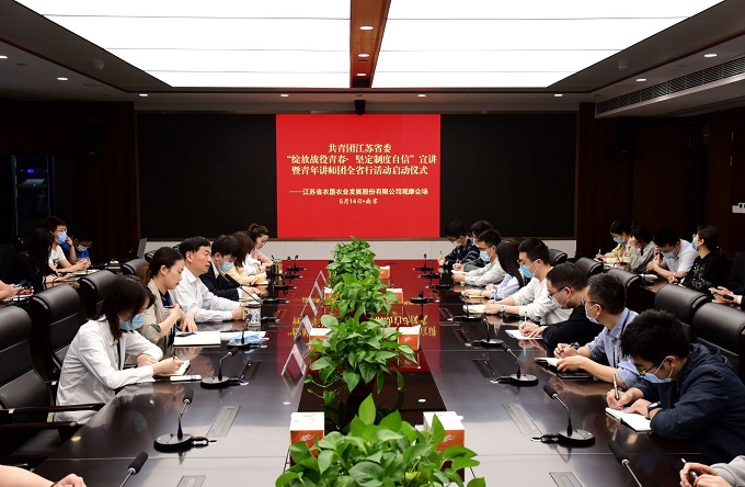 5月14日,蘇墾農發組織觀看共青團江蘇省委“綻放戰役青春堅定制度自信”宣講暨青年講師團全省行活動啟動儀式。公司駐寧子公司、總部團員青年共60人參加。公司黨委委員、工會主席倪志愿出席觀摩會并講話。