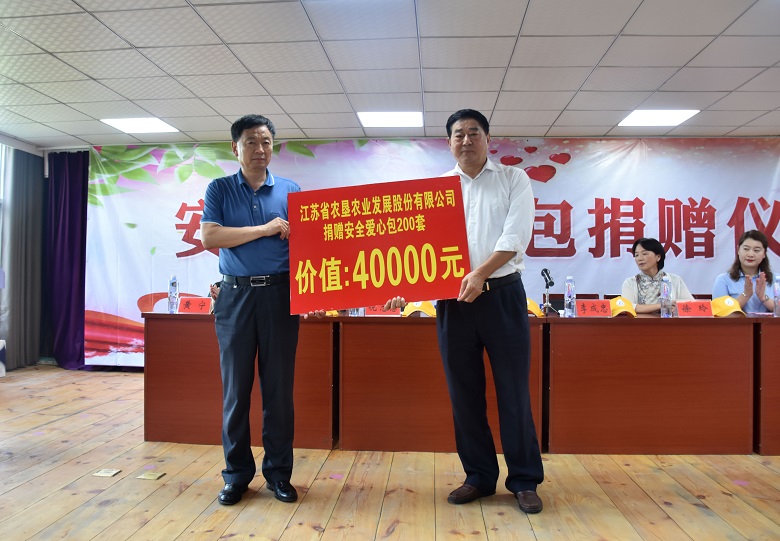 •     9月9日,蘇墾農發股份公司通過省婦女兒童福利基金會向同興鎮中心小學捐贈安全愛心包。蘇墾農發黨委副書記、工會主席倪志愿,江蘇省婦女兒童福利基金會辦公室主任李成忠,市婦聯主席孫小嵐出席本次活動。