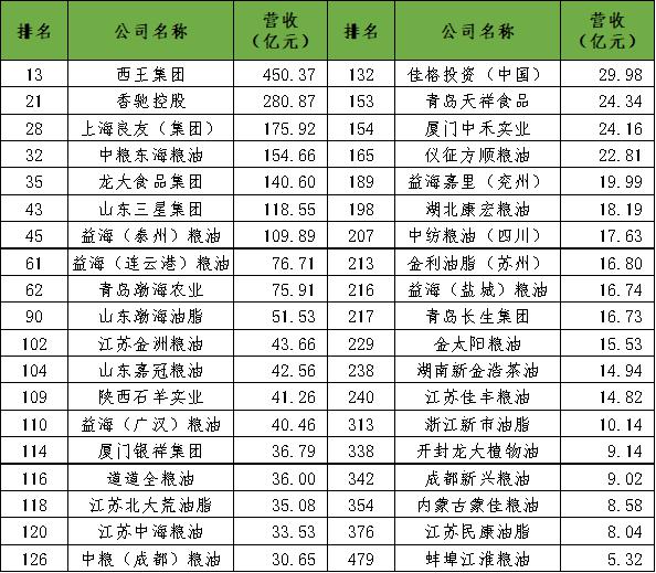 11月初,2020年中國(guó)農(nóng)業(yè)企業(yè)500強(qiáng)榜單發(fā)布。今年評(píng)定主要參考營(yíng)業(yè)收入和利潤(rùn),按照2018年企業(yè)營(yíng)業(yè)收入進(jìn)行排名,入圍門(mén)檻為5億元,全國(guó)28個(gè)省(市、區(qū))參與排名,其中營(yíng)業(yè)收入過(guò)百億的農(nóng)業(yè)企業(yè)有49家。有多家主營(yíng)業(yè)務(wù)為食用油或涵蓋食用油的企業(yè)上榜,這些企業(yè)油脂加工能力、經(jīng)營(yíng)規(guī)模都較強(qiáng),在行業(yè)內(nèi)具有較大的影響力。雖然該榜單依據(jù)的是2018年?duì)I收數(shù)據(jù),有些實(shí)力油企并未納入?yún)⒃u(píng),但由于統(tǒng)計(jì)數(shù)據(jù)往往滯后,而且2019年存在貿(mào)易戰(zhàn)影響的因素,一些企業(yè)的正常經(jīng)營(yíng)受到干擾影響,因此該榜單仍具有相當(dāng)?shù)膮⒖夹浴?/span>
