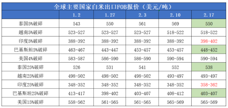 本周印度最大的大米處理地區又開放一處港口,有望緩解擁堵情況,因此大米出口價格有所回落,破碎率5%蒸谷米價格跌至395-401美元,低于一周前的402到408美元。