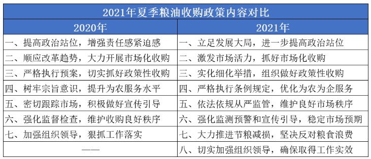 5月6日國家糧食和物資儲備局下發(fā)《關于切實做好2021年夏季糧油收購工作的通知》,當前我國糧食市場形勢錯綜復雜,夏糧收購作為全年收購的首戰(zhàn),組織做好夏糧收購工作至關重要。與2020年相比,今年取消了糧食收購資格許可相關規(guī)定,《通知》指出嚴禁變相審批,不得“明放暗不放”。此外針對市場化收購和政策性收購兩方面,依據(jù)中央經濟工作會議、中央農村工作會議和中央一號文件,國家糧食和物資儲備局作出更為細化的部署安排。《通知》還增加了節(jié)糧減損、糧食浪費方面的內容。