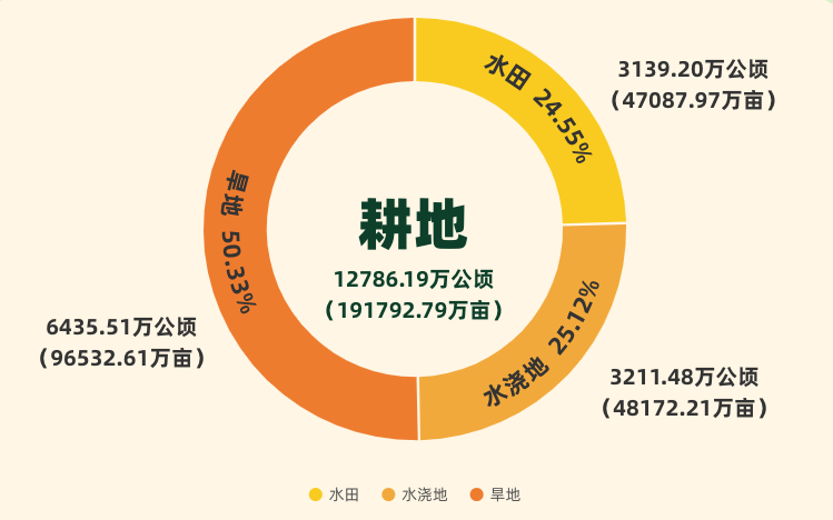 《公報》顯示:我國耕地19.18億畝,其中水田4.71億畝,占24.55%;水澆地4.81億畝,占25.12%;旱地9.65億畝,占50.33%。64%的耕地分布在秦嶺—淮河以北。黑龍江、內(nèi)蒙古、河南、吉林、新疆等五個省份耕地面積較大,占全國耕地的40%。位于一年三熟制地區(qū)的耕地2.82億畝,占全國耕地的14.73%;位于一年兩熟制地區(qū)的耕地7.17億畝,占37.40%;位于一年一熟制地區(qū)的耕地9.18億畝,占47.87%。
