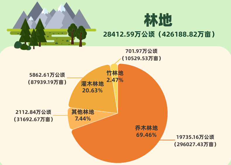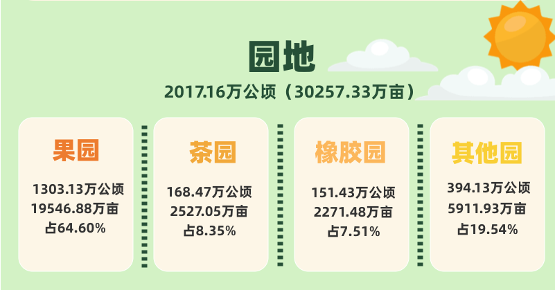 《公報》還顯示:我國園地面積3.03億畝。其中果園1.95億畝,占64.60%;茶園0.25億畝,占8.35%。草地39.68億畝。其中天然牧草地31.98億畝,占80.59%;人工牧草地0.09億畝,占0.22%。林地42.62億畝。濕地3.52億畝。城鎮(zhèn)村及工礦用地5.3億畝。其中村莊用地3.29億畝,占62.13%。交通運輸用地1.43億畝。其中農(nóng)村道路0.71億畝,占49.88%。水域及水利設施用地5.44億畝。其中水庫水面0.51億畝,占9.28%;坑塘水面0.96億畝,占17.69%;溝渠0.53億畝,占9.69%。