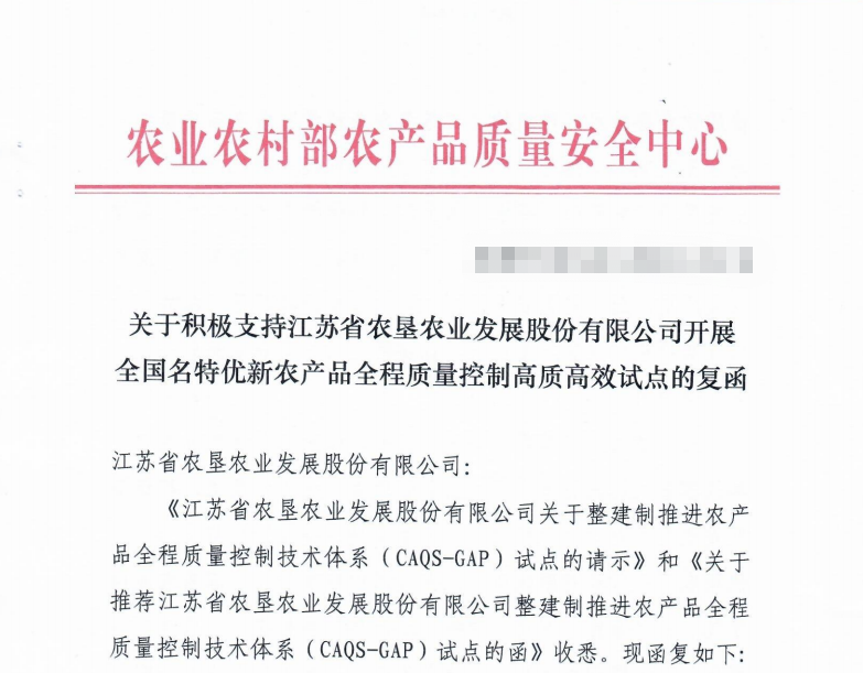 近日,農業農村部農產品質量安全中心正式復函批復江蘇省農墾農業發展股份有限公司(簡稱:蘇墾農發)積極支持開展全國名特優新農產品全程質量控制高質高效試點。蘇墾農發成為全國第二家、江蘇省第一家整建制獲批推進農產品全程質量控制技術體系(CAQS-GAP)試點單位的企業。