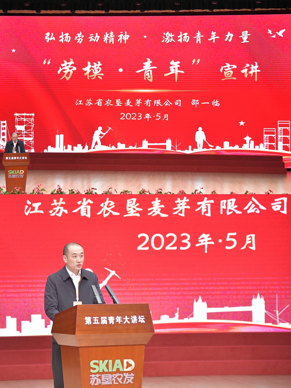 活動期間,還開展了以“弘揚勞模精神 激揚青年力量”為主題的青年勞模宣講。江蘇農墾第五屆勞動模范、蘇墾麥芽黨委委員、副總經理、工會主席邵一臨,是一名80后的青年勞模,他以“功崇惟志 業廣惟勤”為題給青年們進行了宣講,他用自己的親身經歷、成長故事、奮斗歷程,詮釋了勞模精神、勞動精神和奉獻精神,激勵著在場的每位青年,大家紛紛表示,要以勞模先進為榜樣,學習他們愛崗敬業、艱苦奮斗、甘于奉獻、敢于擔當、勇于創新的精神,以更加昂揚的斗志、更加飽滿的熱情投入到自己的工作和生活中去。