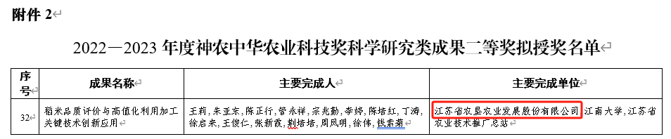 近日,2022—2023年度神農中華農業科技獎189項擬授獎成果公示,江蘇省農墾農業發展股份有限公司作為第一完成單位的“稻米品質評價與高值話利用加工關鍵技術創新應用”項目成果成功入圍“2022—2023年度神農中華農業科技獎科學研究類成果二等獎擬授獎名單”。