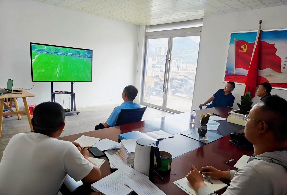 在外拓基地張灣生產(chǎn)區(qū)會(huì)議室,生產(chǎn)區(qū)管理人員和基地管理辦公室技術(shù)人員正在通過(guò)大疆司空系統(tǒng)對(duì)無(wú)人機(jī)巡田過(guò)程進(jìn)行現(xiàn)場(chǎng)直播,操控人員在田間按照提前規(guī)劃好的航線操控?zé)o人機(jī),生產(chǎn)區(qū)管理人員在會(huì)議室通過(guò)投屏進(jìn)行現(xiàn)場(chǎng)觀看。觀看過(guò)程中,農(nóng)業(yè)生產(chǎn)技術(shù)人員將田間管理不足之處一一指出,讓生產(chǎn)區(qū)管理人員更加直觀、充分的了解到哪些地方還需要改進(jìn)。