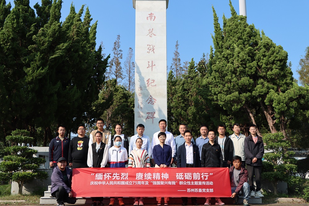 為慶祝中華人民共和國成立75周年,深入落實《新時代愛國主義教育實施綱要》,2024年10月8日蘇州蘇墾開展“緬懷先烈 賡續精神 砥礪前行”慶祝中華人民共和國成立75周年及“強國復興有我”群眾性主題宣傳活動,引導廣大黨員群眾“沉浸式”學習,傳承紅色,緬懷先烈、銘記歷史,不忘初心使命,汲取奮進力量。